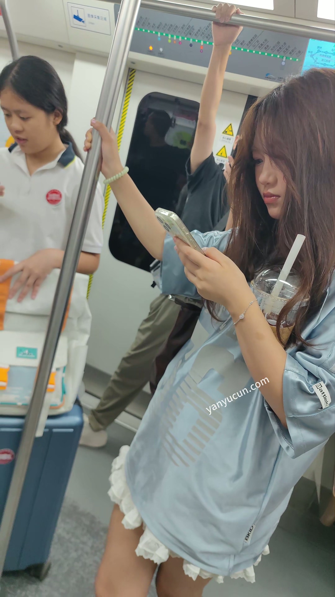 XM379白色连衣裙清纯小美女坐地铁专心玩手机,前后抄底 ...