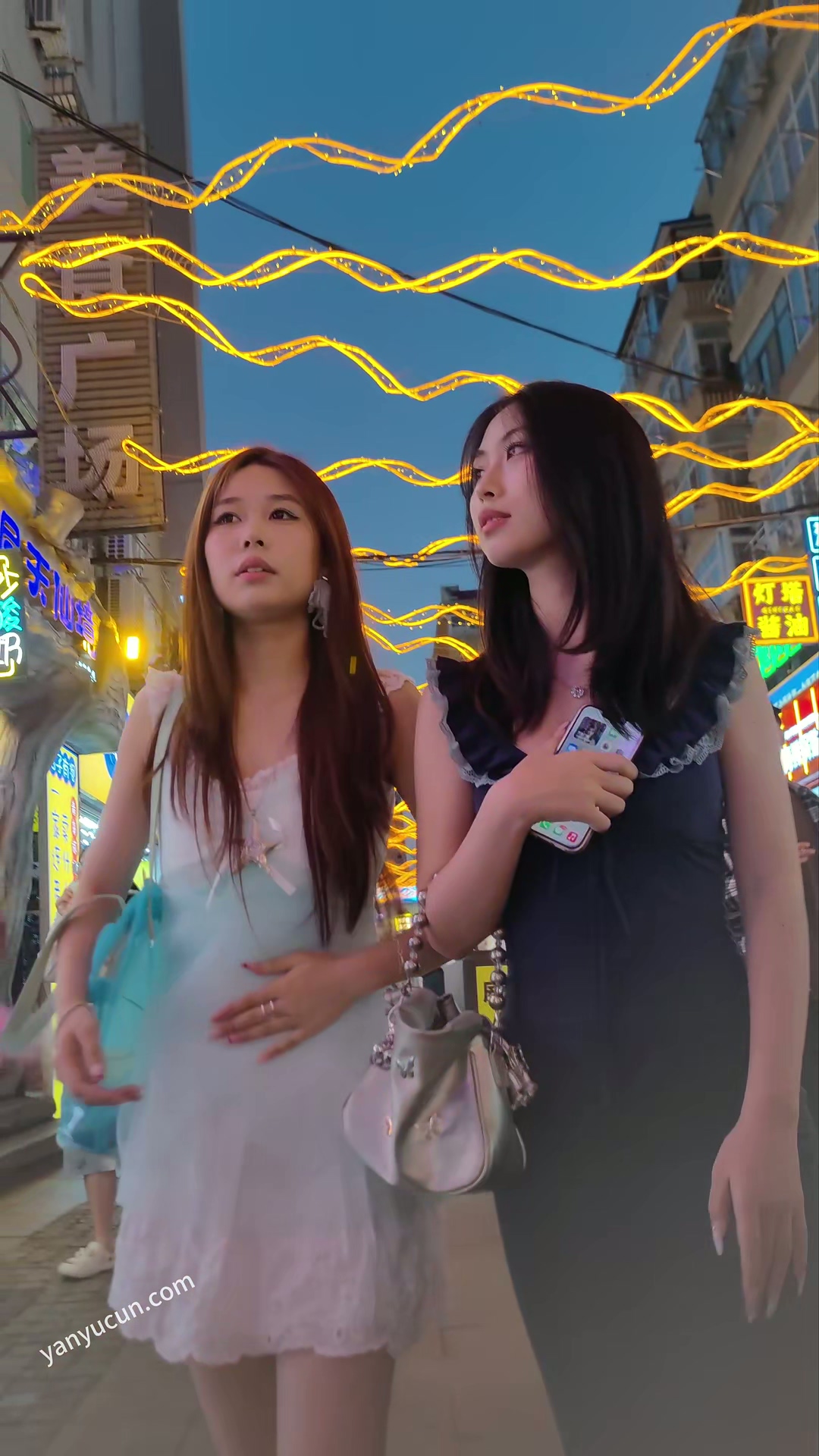 XM405蓝白连衣裙小姐姐和闺蜜逛夜市,黄色内内 ...