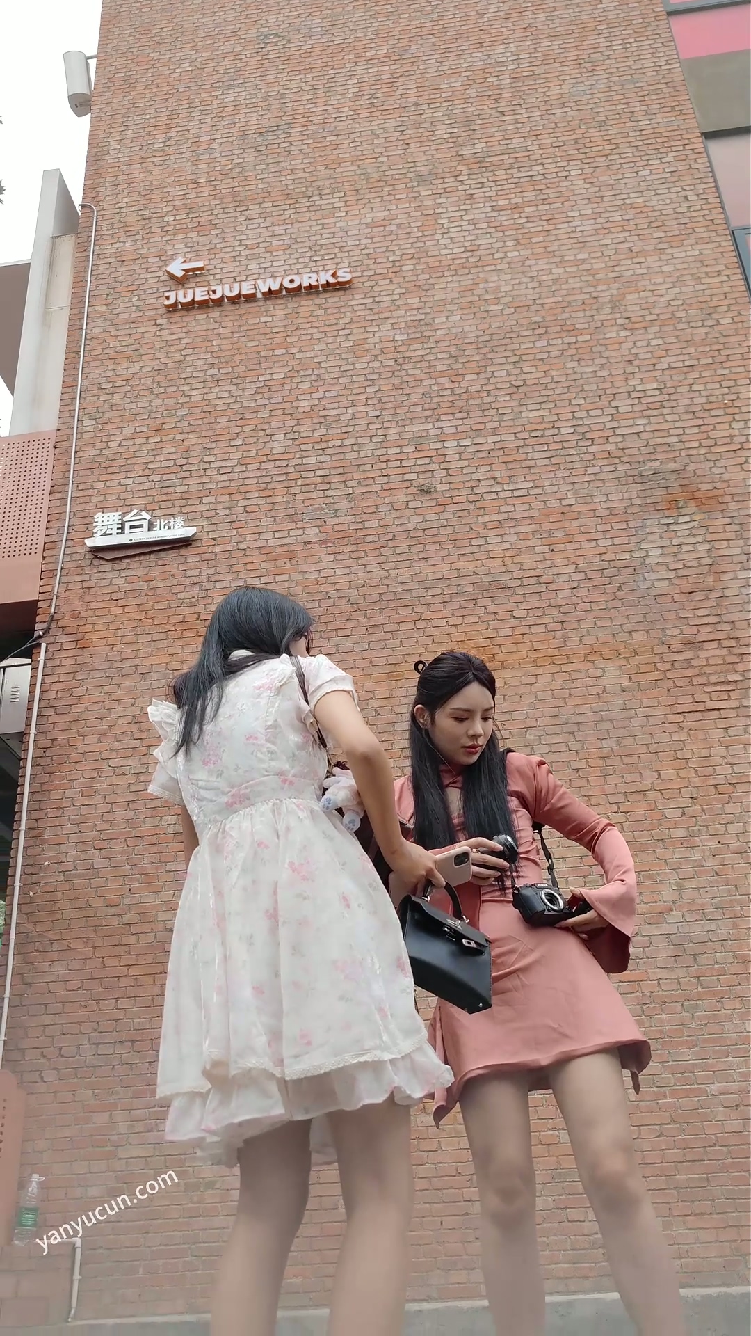 XM420粉色连衣裙极品美女和闺蜜网红地打卡拍照,白色内内